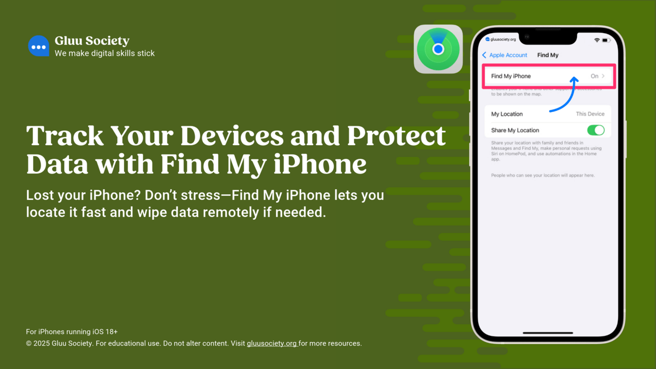 Apple’s “Find My” feature helps locate, lock, and erase a lost or stolen device remotely. In this lesson, learners set up Find My iPhone and learn how to use it for added security (and to find devices lost around the house!). This lesson is part of Unscammable Essentials Phase 1.