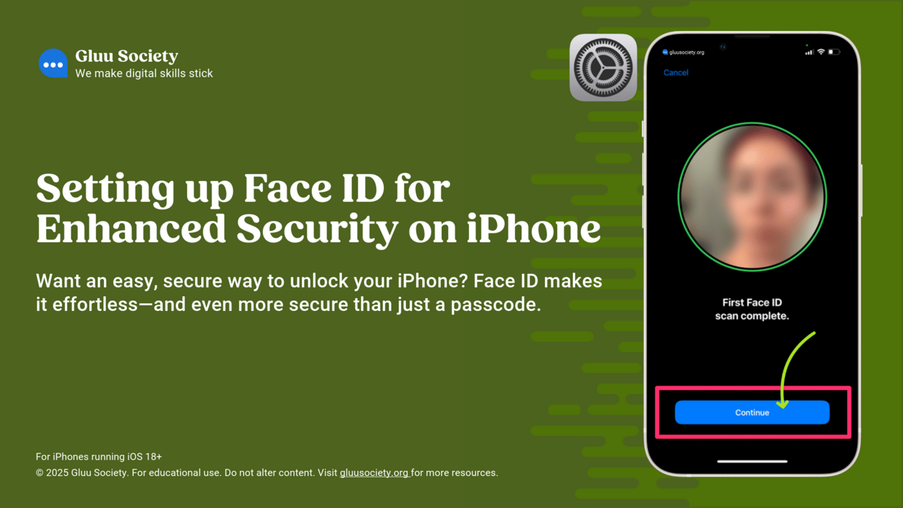 Face ID makes unlocking an iPhone fast and secure, while also protecting apps, passwords, and Apple Pay. In this lesson, learners set up Face ID and understand how it strengthens device security. This lesson is part of Unscammable Essentials Phase 1.